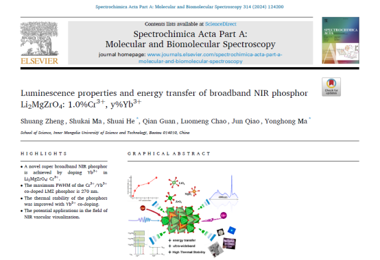 今年,《Spectrochimica Acta Part A:Molecular and Biomolecular Spectroscopy》(中科院2区,影响因子为4.2997)刊发了公司硕士研究生学术论文“Luminescence properties and energy transfer of broadband NIR phosphor Li2MgZrO4: 1.0%Cr3+, y%Yb3+”。公司2022级物理学专业硕士研究生郑爽为该论文第一作者,公司马永红教授与物理学硕士生导师贺帅为通讯作者。mobile28365为论文唯一单位和通讯单位。该研究小组依托公司“稀土发光材料”研究平台,开展了超宽带近红外发光材料设计及其在NIR光源中的应用研究,为相关领域提供了重要的理论支持和实践基础。