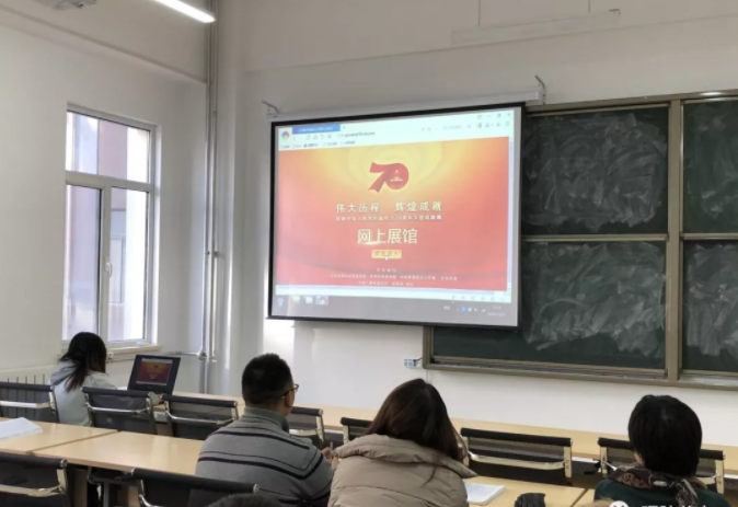 支部书记包文明老师在观看视频前,对中华人民共和国成立70周年的大型成就作了一个简要介绍,提起了大家对成就展的浓厚兴趣。网上展馆以新媒体平台为依托,运用全景观展技术,采用多媒体互动叠加图文、音视频等形式,360度全景展示现场,生动再现展览全貌。大家通过观看视频,身临其境感受到了新中国成立70年来的伟大历程和辉煌成就。