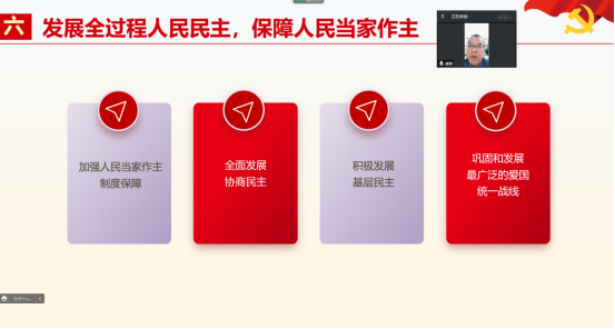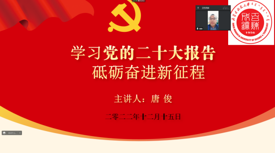 为持续深入学习贯彻党的二十大精神,12月15日,mobile28365党委副书记唐俊以《学习党的二十大报告 砥砺奋进新征程》为题,为mobile28365全体教职工和员工党员讲授学习贯彻党的二十大精神专题党课,党课讲授在腾讯会议线上平台开展。