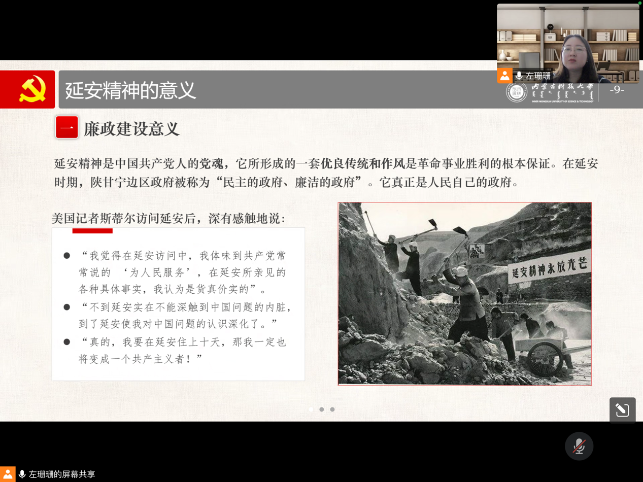 2022年11月11日,mobile28365员工第二党支部组织开展了线上“党支部书记讲授党史”专题活动。参加本次学习会的有支部全体党员和入党积极分子,大家准时上线进行学习。此次党课的主题是“延安精神”。左珊珊老师从“延安精神历史地位和评价”、“延安精神的主要内容解读”、“在新的历史条件下大力弘扬延安精神”三个方面展开论述,更进一步地解读了延安精神的现实意义。延安是中国革命的圣地,新中国的摇篮,从1935年到1948年党中央和毛泽东等老一辈革命家在延安生活和战斗了13年,领导中国革命事业从低潮走向高潮、实现历史性转折,支持了中国革命走向胜利,为中国革命事业作出了巨大贡献。正是这种为民族和人民的解放事业,为崇高的共产主义理想矢志不渝、英勇献身的精神培养形成和发展了延安精神,延安精神是民族精神的升华,是革命精神的传承,是马克思主义中国化的重要成果,是时代精神的体现。