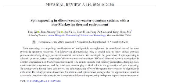 近日,2023级物理学专业硕士研究生奚滢同学以第一作者身份在国际物理学权威期刊《Physical Review A》上发表了题为“Spin squeezing in silicon-vacancy-center quantum systems with a non-Markovian thermal environment”的学术论文,通讯作者为公司马永红教授。mobile28365为论文第一单位。Physical Review A是美国物理学会(American Physical Society)主办的物理学术期刊之一,主要发表量子信息、原子分子物理及光物理相关的高水平前沿学术成果,是国际物理学界广泛认可的享有高度学术声誉的期刊之一。