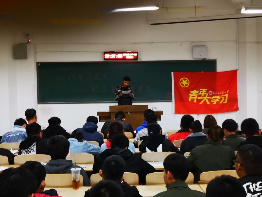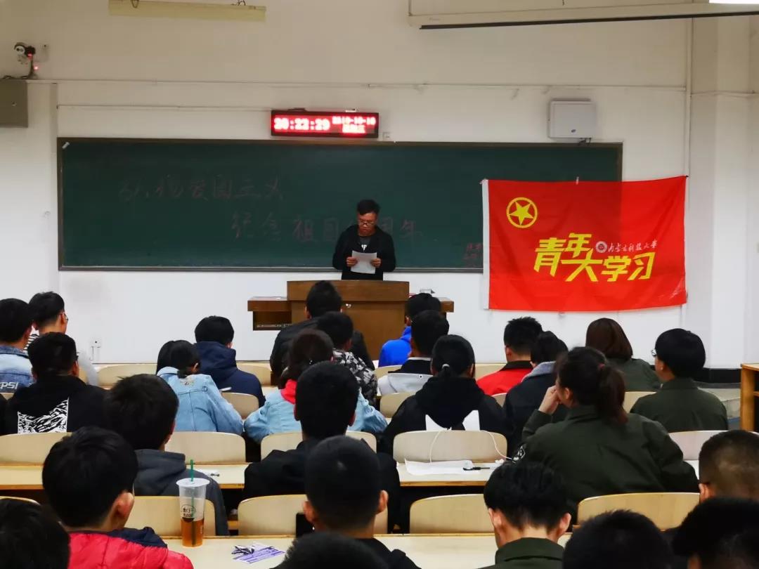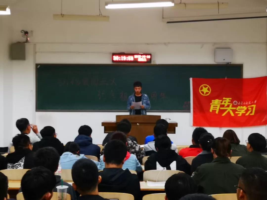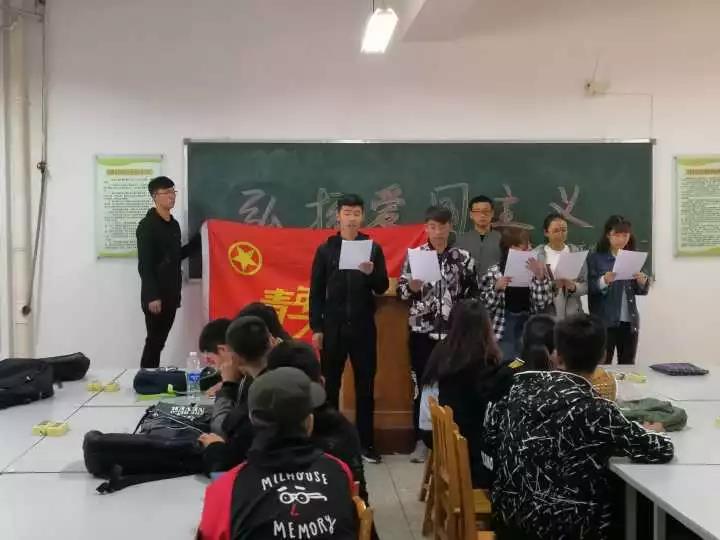 2018年10月10日,物理三班在文馨书院A201举办了团日活动。活动中,由八名同学围绕爱国精神进行了朗诵和典例介绍,重温历史人物的英雄事迹,以他们为榜样。大家各抒己见,畅谈爱国,畅谈理想,气氛十分活跃。让同学们感受到青春向上的正能量。并由团支书最后进行总结发言,弘扬爱国主义。